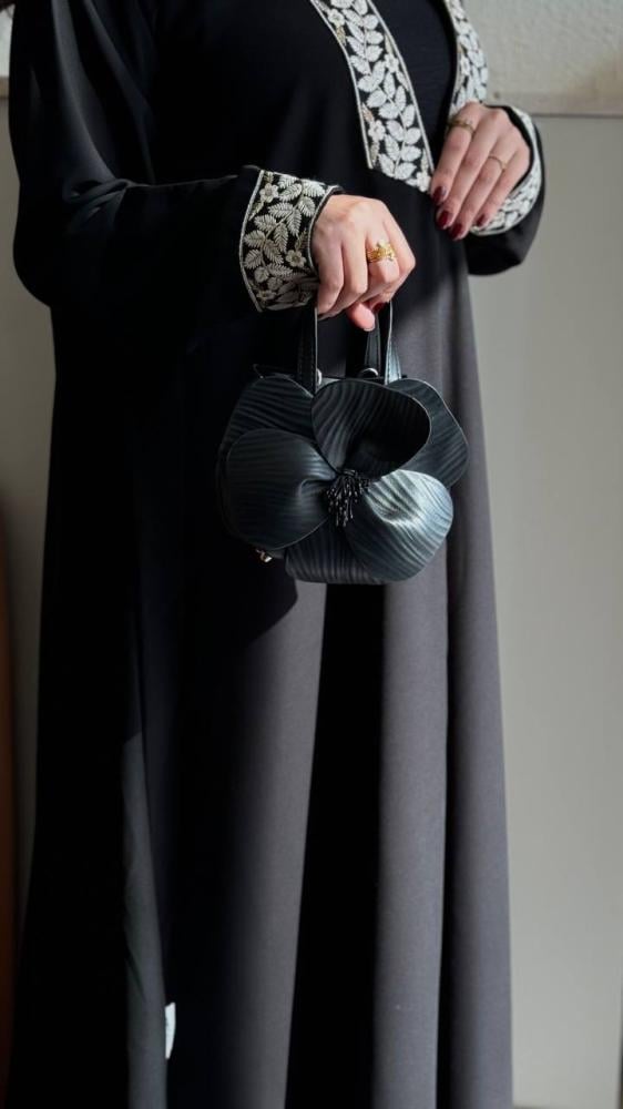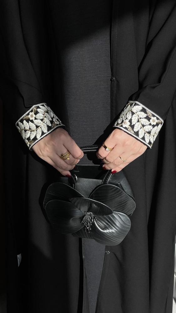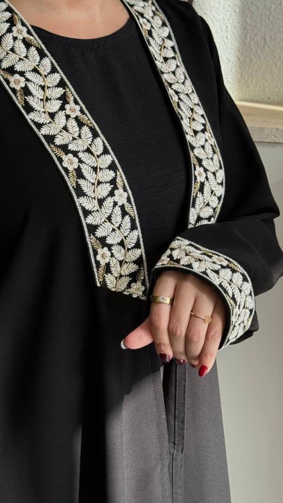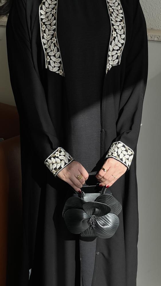 عبايه بقماش كريب سواد فاحم مع كلفه ورد تطريز على الصدر و الاكمام نص كلوش .